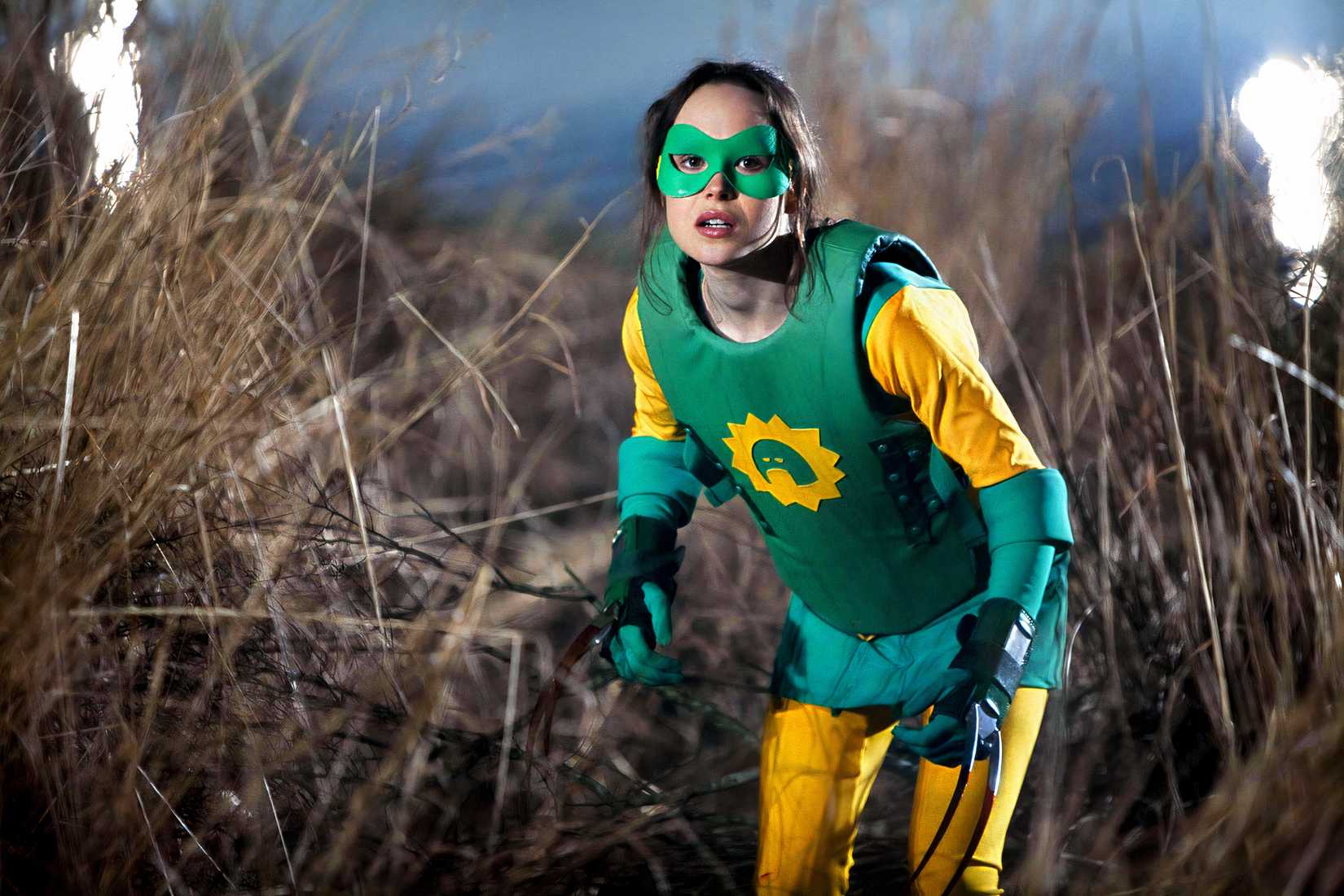 In Super, when Frank is first looking into becoming a superhero, he visits his local comic shop to do some research. There he meets Libby (Elliot Page), a young employee who helps him pick out comics. As Frank’s exploits begin to show up on the news and his research-oriented trips to the comic shop become more frequent, Libby realizes he’s the Crimson Bolt. Before long, she’s begging Frank to let her be his kid sidekick. (Even though she’s 22, she looks very young and is of short stature; essential elements of the traditional kid sidekick look).