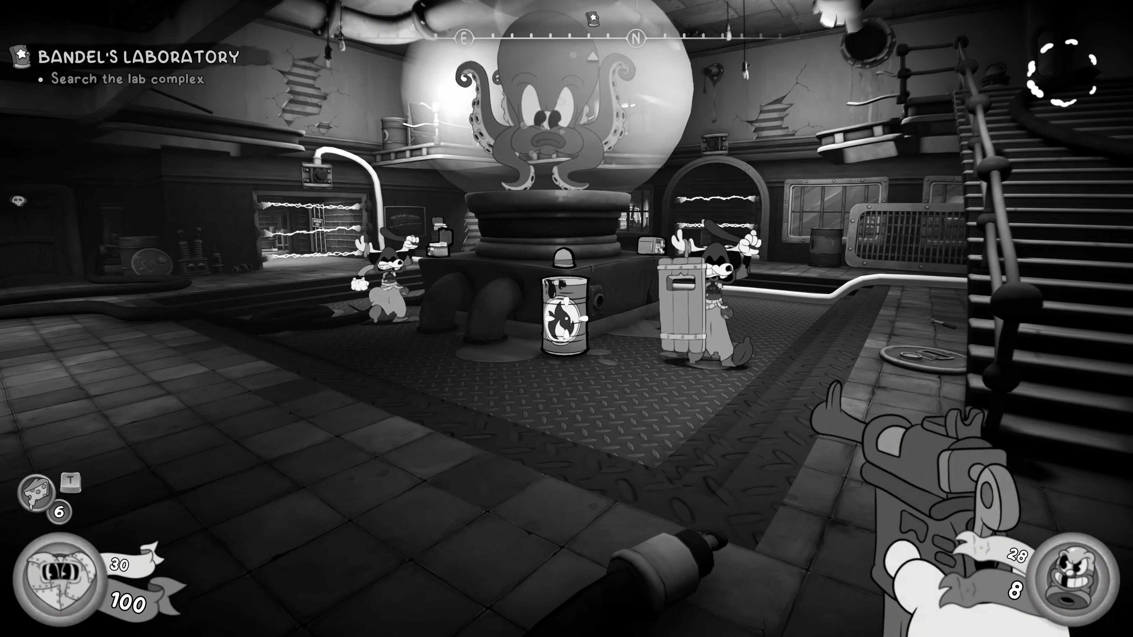 In the next room, you'll find... well, there's no other way to say this: a giant angry octopus in a jar. More importantly, you'll be attacked by more enemies, but your Micer and Boomstick are more than enough for them, especially with that flame barrel at the base of the octopus, ready for shooting.