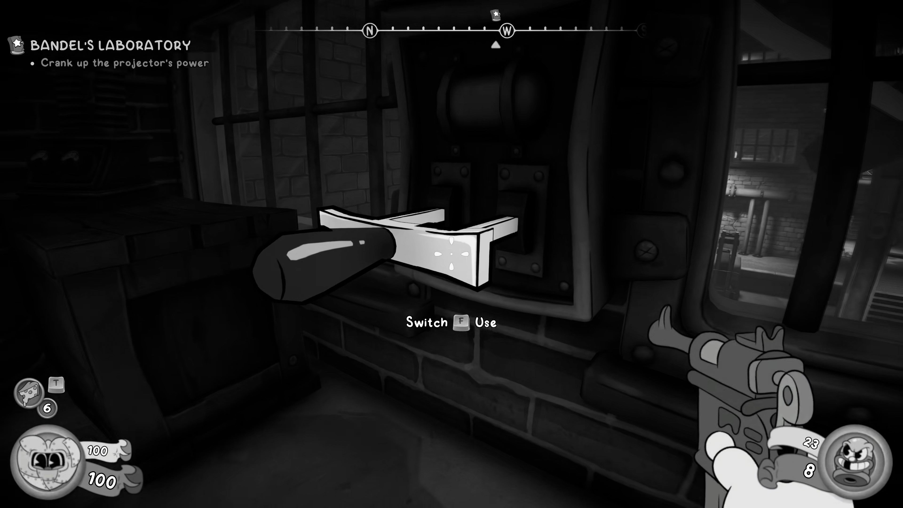 Then head through the left way and up the ladder. Save your game at the Typewriter, and pull the lever next to the locked door to crank up the projector's power.