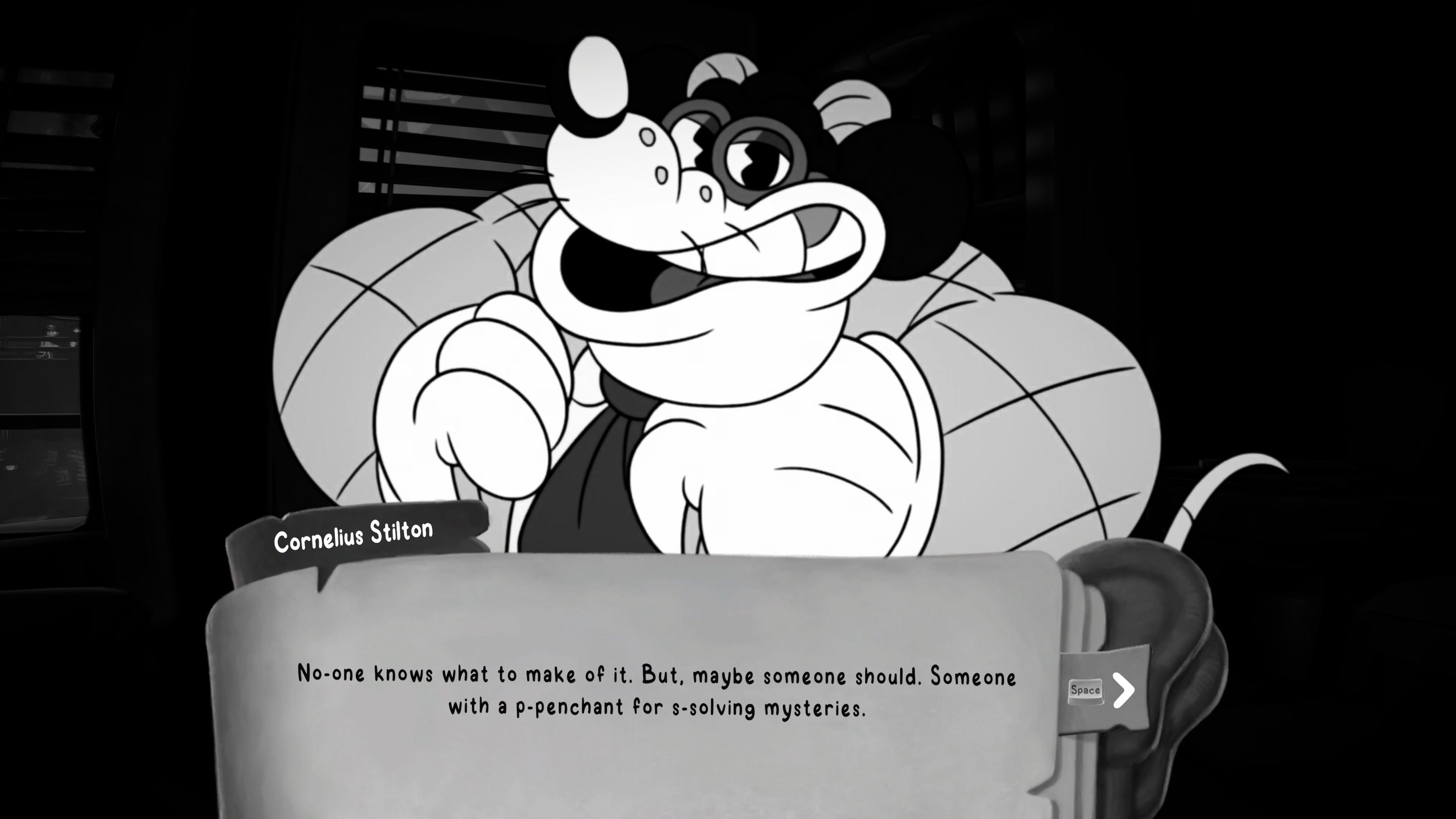Once you've finished upgrading your weapons, all that's left is to enter your office. Interact with the Crime Board and pin your clues there, and then speak with Stilton, who's found his way into your office and has been waiting for you.
